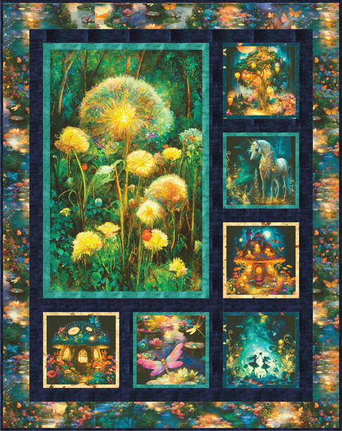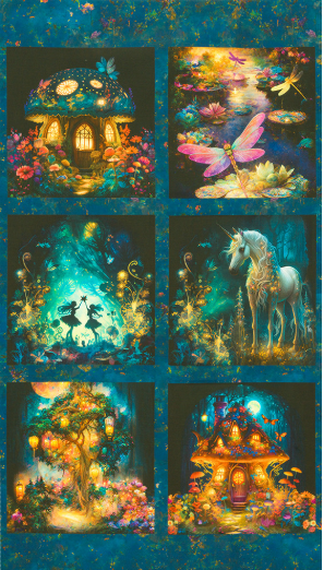 This enchanting fabric collection features a magical garden theme. The rich, vibrant colors and detailed artwork create a dreamy, fairy-tale atmosphere including a whimsical mushroom house surrounded by flowers, butterflies, dandelions, and beautiful panels, with a panel showcasing six distinct magical scenes.