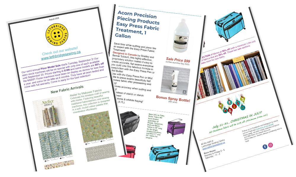 Welcome to Lethbridge Sewing Centre! Whether you’re a seasoned seamstress or just beginning your sewing journey, our store is your one-stop destination for all things sewing. Explore our wide range of sewing machines, from innovative computerized models to robust mechanical ones, and discover our diverse selection of fabrics and sewing accessories. Take advantage of our in-house classes to hone your skills or attend one of our workshops to get inspired. Our friendly and knowledgeable staff is here to help you find exactly what you need to bring your creative visions to life. Nobody Knows Sewing Better…. Than Lethbridge Sewing Centre!